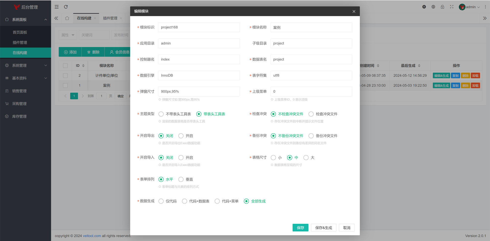 Veitool 在线模块构建器是基于 Veitool v2.0.1版主框架开发的一款插件,可在线自由配置数据表字段、表格列表规划呈现、详细弹窗规划呈现、添加及编辑的表单项规划呈现,可快速生成统一代码风格的控制器、模型、视图代码,可大大节省认证开发者在开发时耗费在CURD和页面布局上的时间。