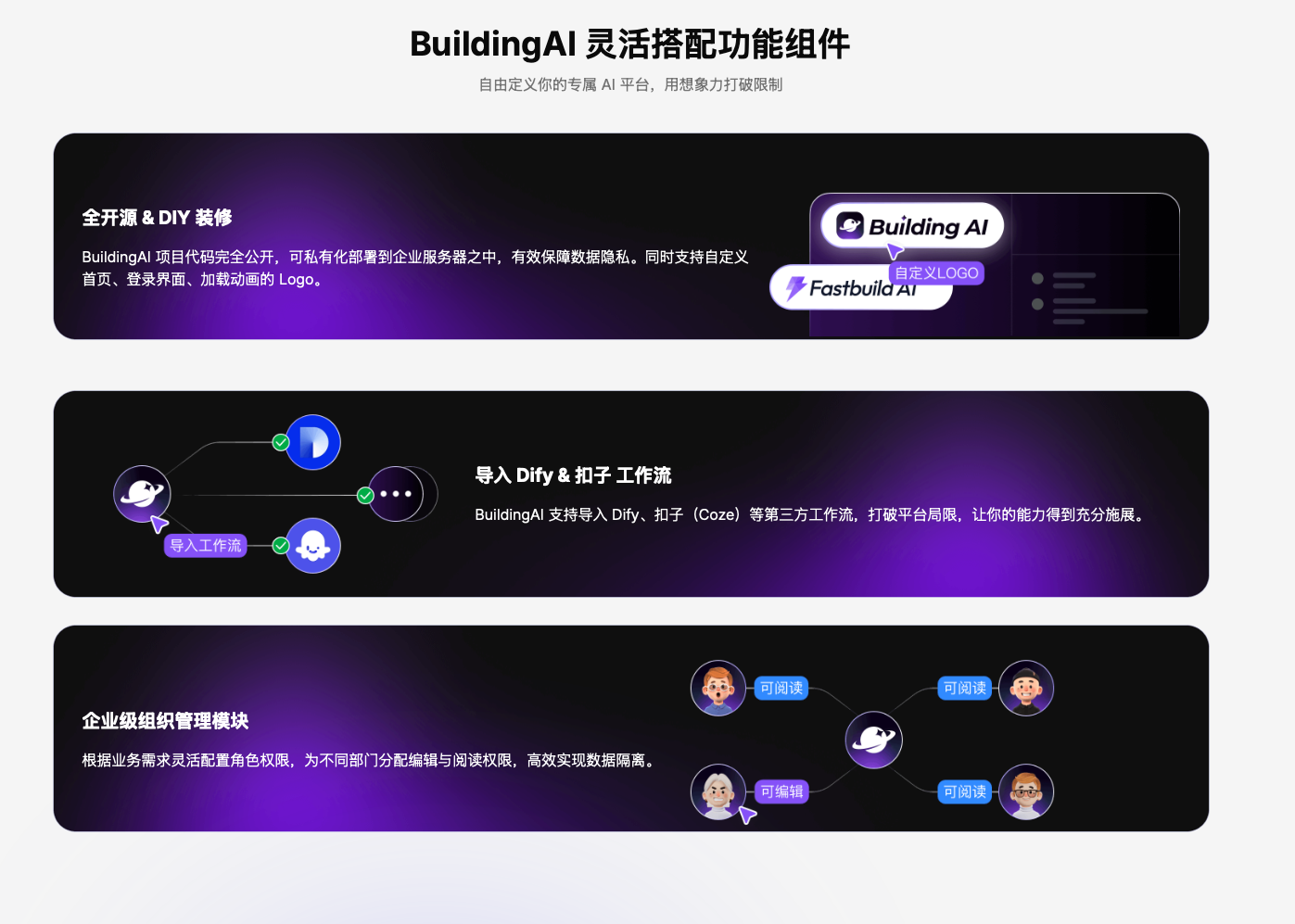 基座大模型由巨头们垄断发行的既定事实下,在AI应用层的战场,BuildingAI希望借助自由分发、免费商用的开源精神,与广大AI玩家共同实现AI平权。乾坤仍然未定,你我皆是黑马,一起携手扬帆起航吧!