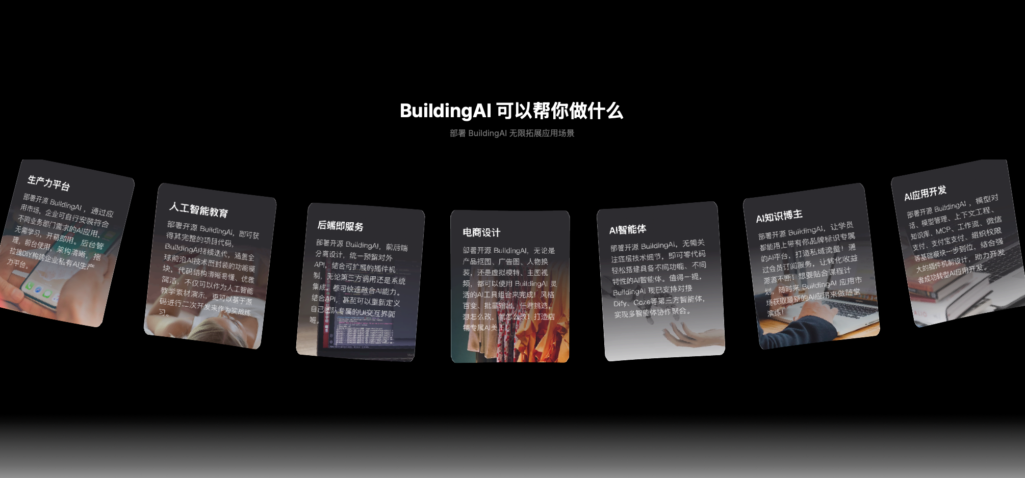 BuildingAI 的愿景是成为新一代AI应用基础设施提供商,为超级个体、一人公司和精益创业者们提供特性丰富、开箱即用的AI技术支持。