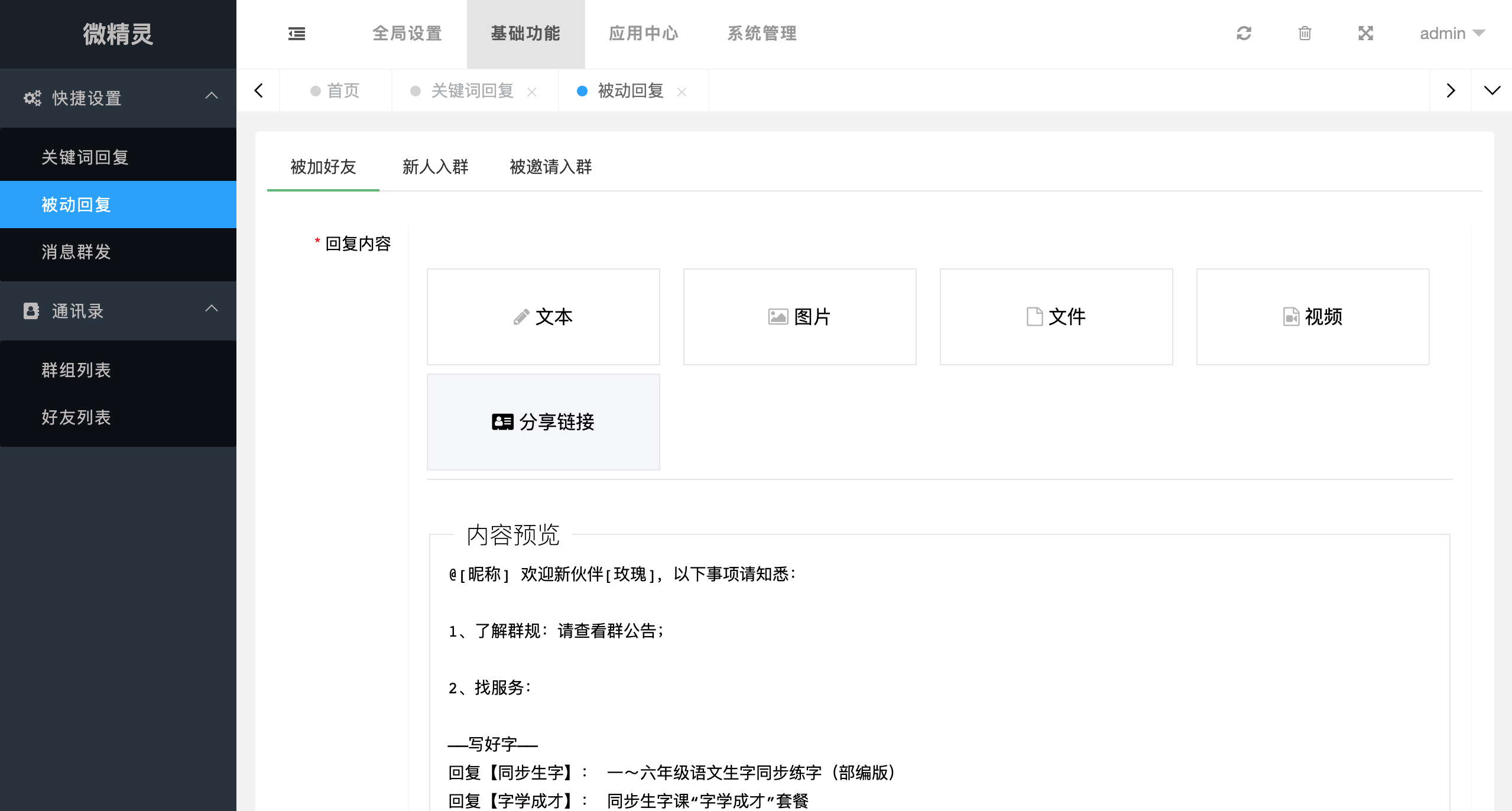 首先,系统支持多机器人框架驱动,目前支持了西瓜框架、可爱猫、e小天、我的(个微和企微)、VLW(个微和企微)、Web微信,用户可以选择自己喜欢的框架,灵活运用,提高了系统的可定制性。