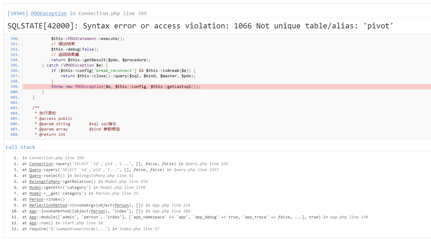 SELECT `id`,`pid`,`title_cn`,`category`.*,pivot.category_id AS pivot__category_id,pivot.article_id AS pivot__article_id FROM `category` INNER JOIN `category_article` `pivot` ON `pivot`.`category_id`=`category`.`id` INNER JOIN `category_article` `pivot` ON `pivot`.`category_id`=`category`.`id` WHERE `pivot`.`article_id` = 2966做了两次join,直接报错了.在think\model\relation\BelongsToMany 248行 belongsToManyQuery操作中,$this->query已经带有join语句了,255行又加了同样的join语句造成以上的错误.