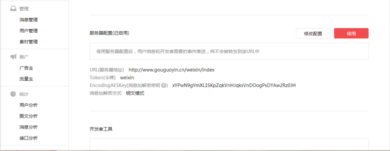 登录公众平台后台,点击开发者中心 -> 服务器配置-> 修改配置->配置项,输入URL,Token和EncodingAESKey,URL输入http://你的域名/weixin/index,Token填写weixin,EncodingAESKey填写随机生成的字符串,如下图: