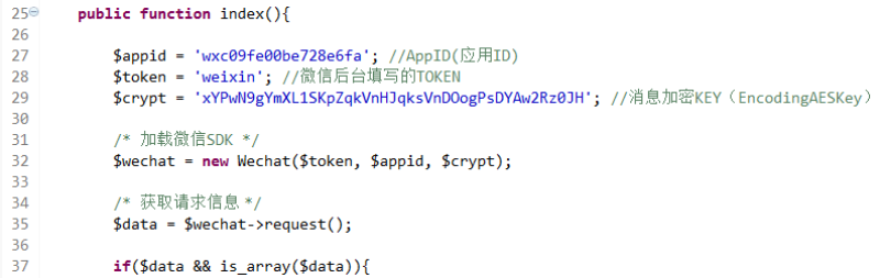将下载的源码压缩包解压,将里面的Com文件夹放入THINKPHP框架的Library文件夹中,将WeixinController.class.php放入Home模块里的Controller文件夹中,修改里面的appid为自己公众平台的appid,