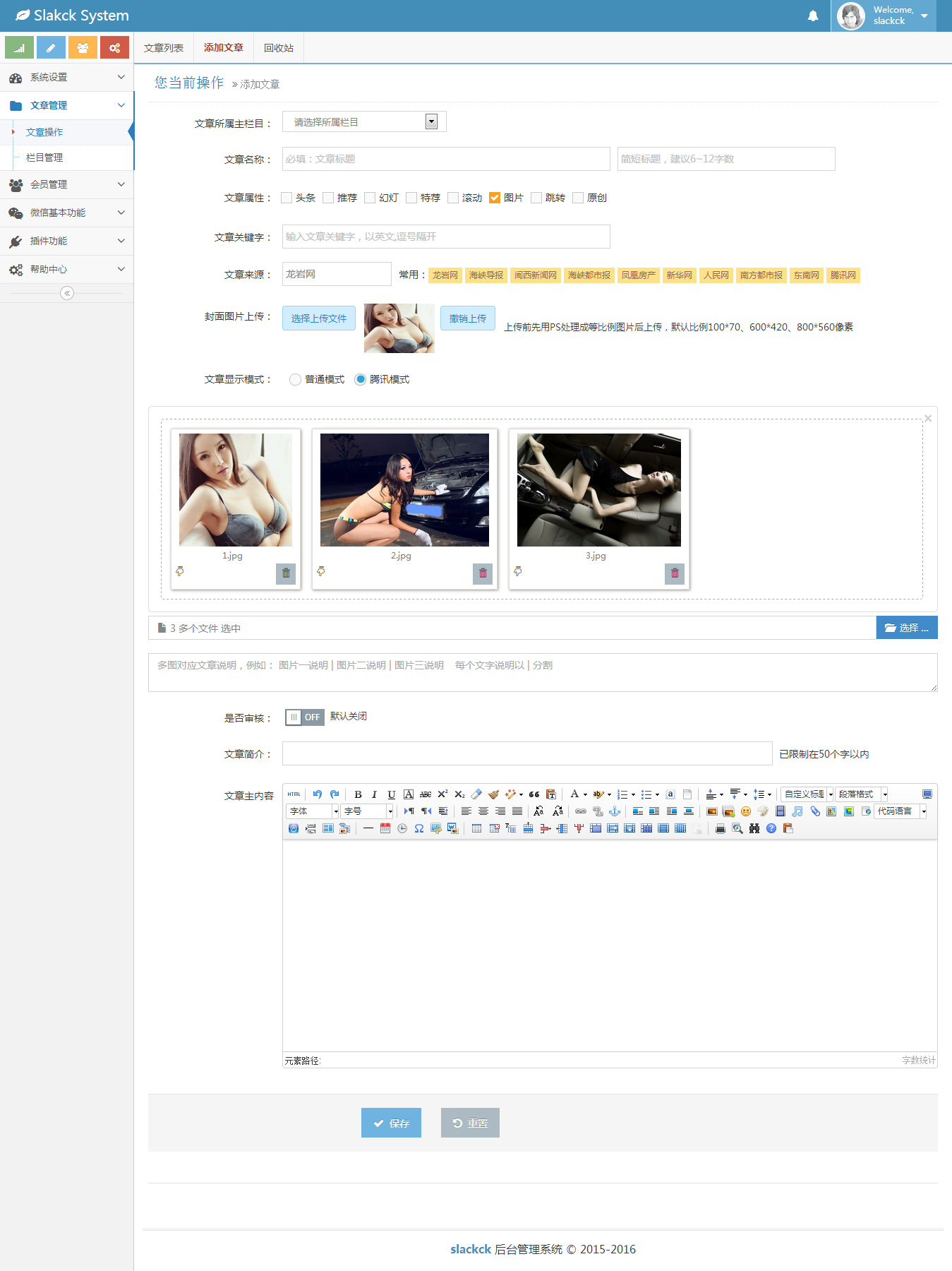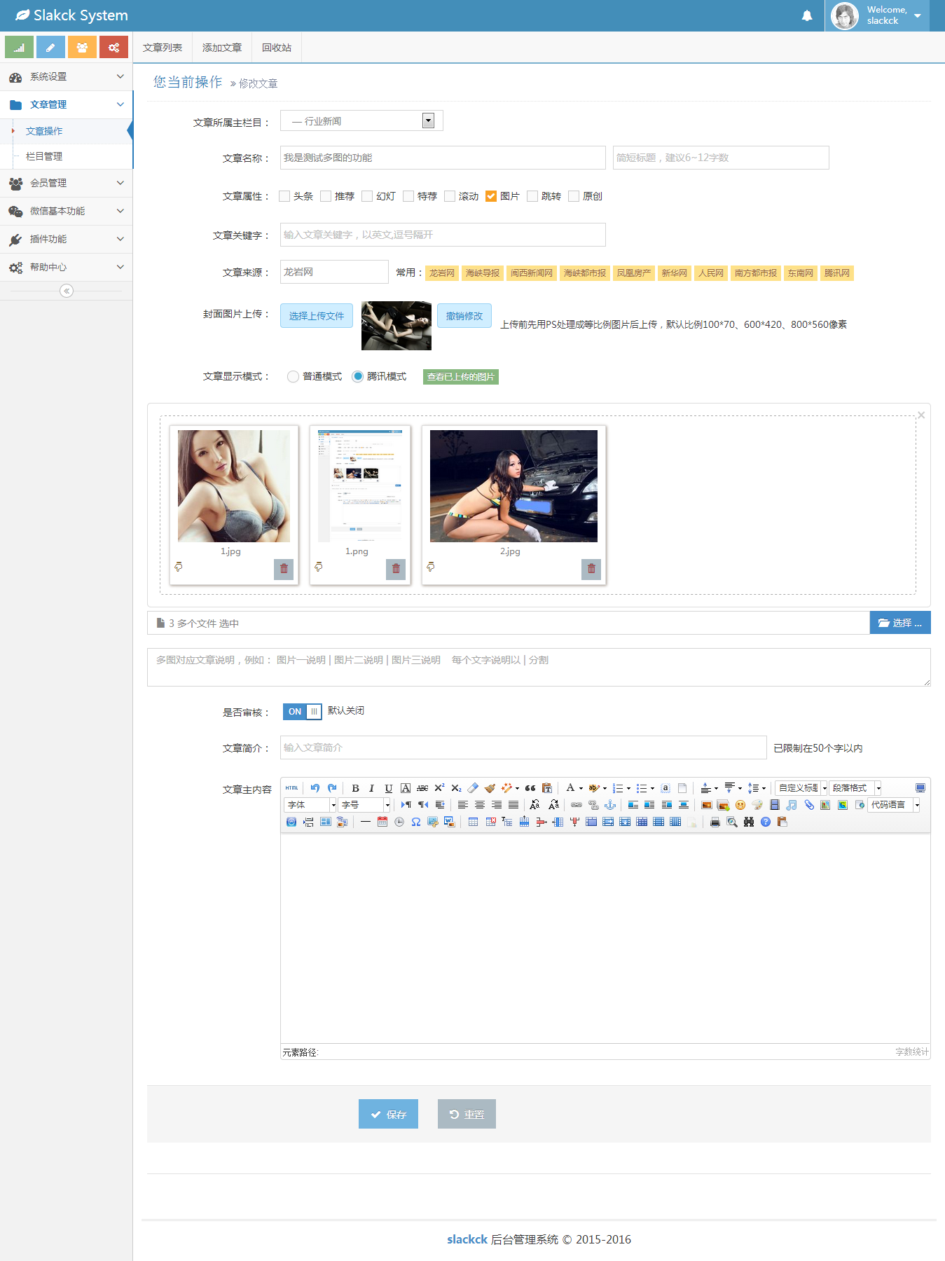 文章模块添加了2种模式,一种是普通文章格式,另一种是腾讯文章格式,腾讯文章格式主要是多图格式下面会有贴图,目前只做了后台,还没有运用到前台,不过会点程序的都可以自己做前台了。