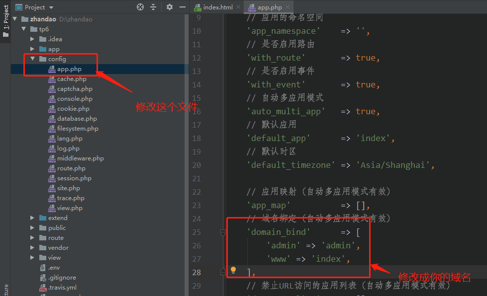 本程序采用前后台分离的方法,本地请创建admin.XXXX.com后台地址(xxxx.com代表你的域名),创建www.xxxx.com域名,修改根目录下config文件夹下app.php文件,如图: