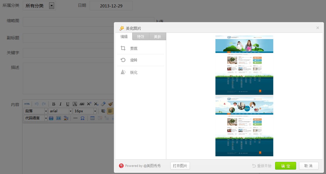3、缩略图的上传、剪裁、美化都基于美图秀秀的在线编辑功能