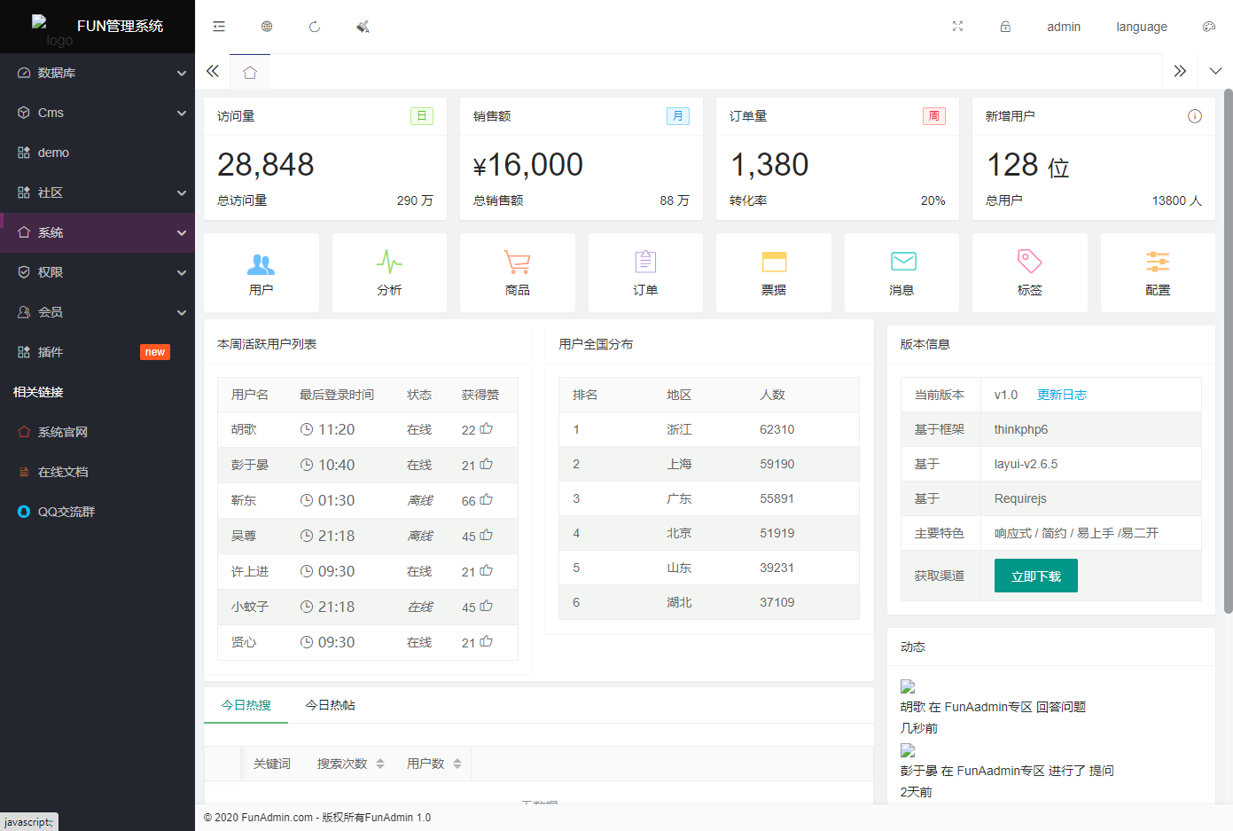 FunAdmin 支持最新版本 6.0.8+layui2.6.* +php8