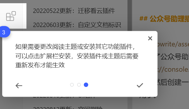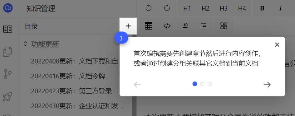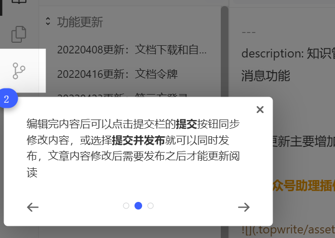 首次打开编辑界面会显示引导提示,帮助你快速了解文档的编辑和发布流程,以及如何在MD模式和可视化模式之间切换和进行全文预览。