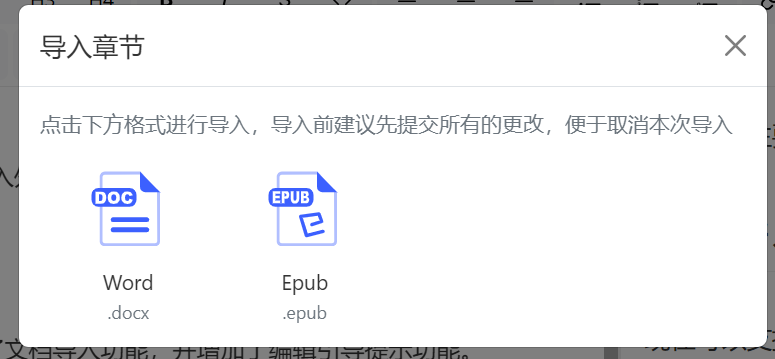 现在可以支持在文档中导入外部文档(目前支持的格式包括Word和Epub格式),如果选择在某个章节导入则会作为章节子目录导入,也可以支持导入成单篇章节。