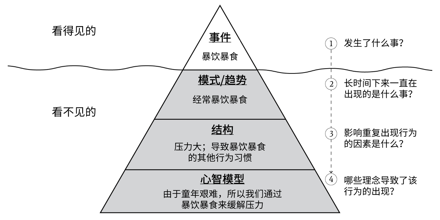 > **我们应该如何解决一个问题?一般来说,最下意识的动作就是根据所看到的东西做出反应并得出结论。例如,如果吃得太多还不运动,那体重必然会增加。只看表面的话,解决这个问题的办法基本就是管住嘴迈开腿。但这其实是一种不完全正确的解决思路。如果你具备系统思考能力,那你首先应该会问:“为什么会只吃不运动?真正的原因是什么?”因此,首先要弄清楚是什么引发并造成了这个问题,并基于这一认识再采取行动,这才是冰山模型这一系统思维模型存在且有效的原因。**