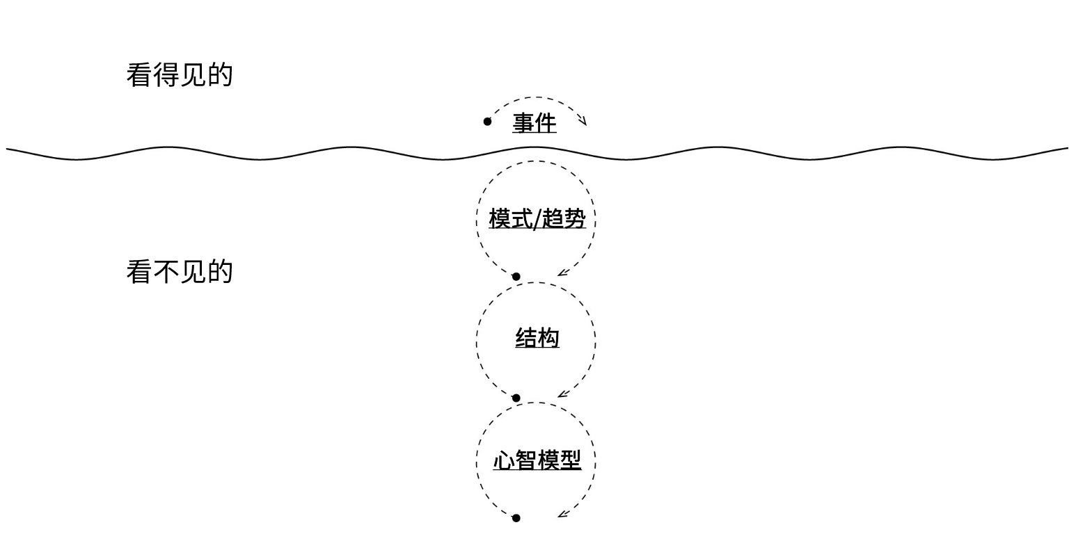冰山模型从上往下包括<strong>四个层次:事件(event)、模式(pattern)、结构(structure)和心智模型(mental models)。</strong>每往下移动一个层次都能进一步深入挖掘新的内容,同时还有助于帮你转换视角,以便能找到导致事件发生的系统和世界观。