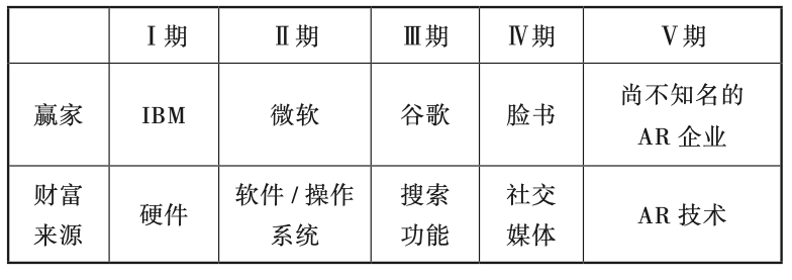 最后的胜利不属于 GAFA(Google、Apple、Facebook和Amazon)。每一个时代最强的那个公司,从 IBM 到微软,再到谷歌和脸书,可能都会想要在 AR 的世界里站在最领先的位置。但是纵观颠覆性技术的发展史,一个领域的主导者从来无法在下一个时代的平台上继续称雄。因为它们的成功会成为它们最大的桎梏。