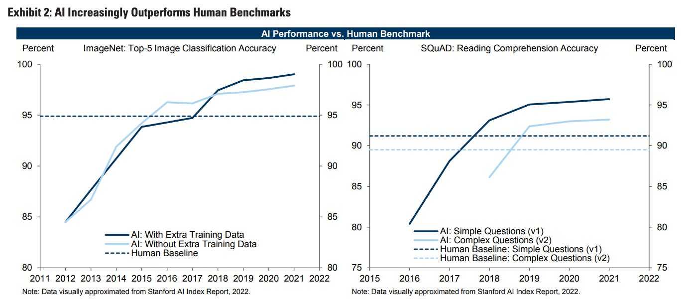 验证码的更新迭代反映了技术的最新应用——强大的人工智能模型现在处理人类的独特任务也能表现得比人更好了。这张图表里面的实线展示的是人工智能在图像分类和阅读理解方面相对于人类基准(虚线)的表现: