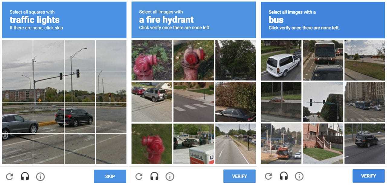 后来验证码不再给我们提供歪歪扭扭的单词了。它的新迭代我们都很熟悉,交通灯、人行横道、车辆的图块。