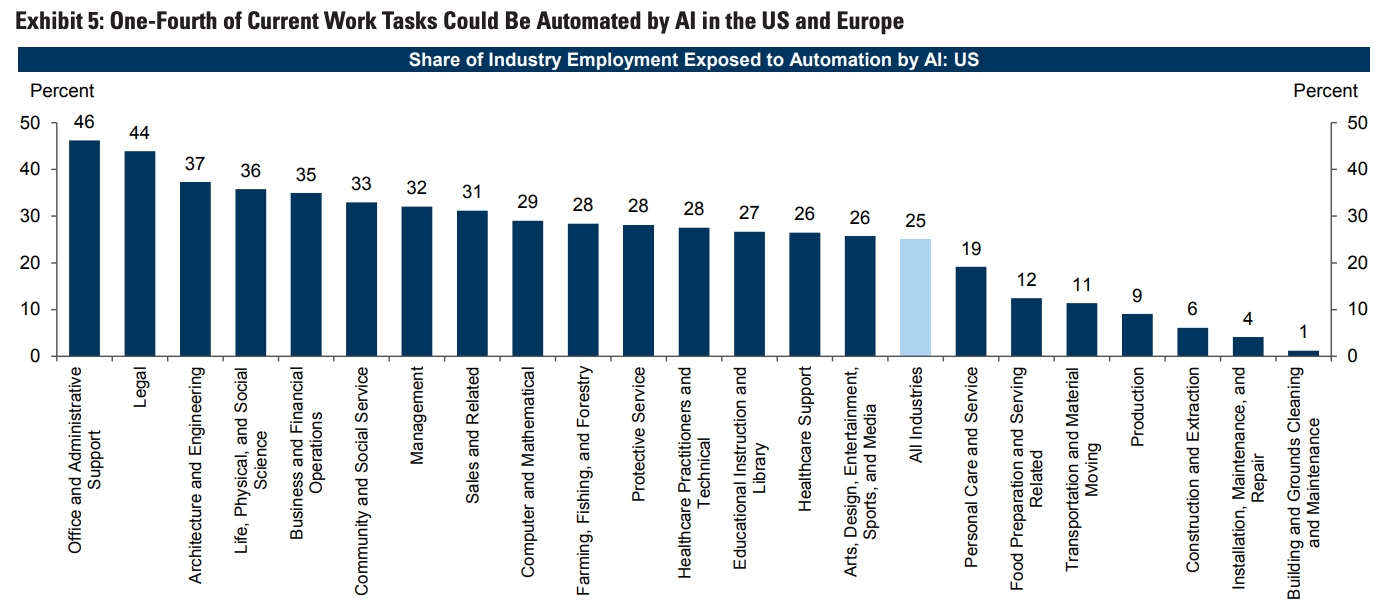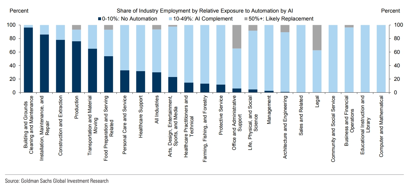 面临自动化冲击的首先的是普通人。据高盛研究(Goldman Sachs Research)估计,生成式人工智能会导致 3 亿个全职工作岗位面临自动化,当前的工作岗位当中有三分之二已经实现了一定程度的自动化。以下是高盛预计受影响最大的行业的可视化图表。行政办公工作、法律工作、建筑与工程首当其冲。