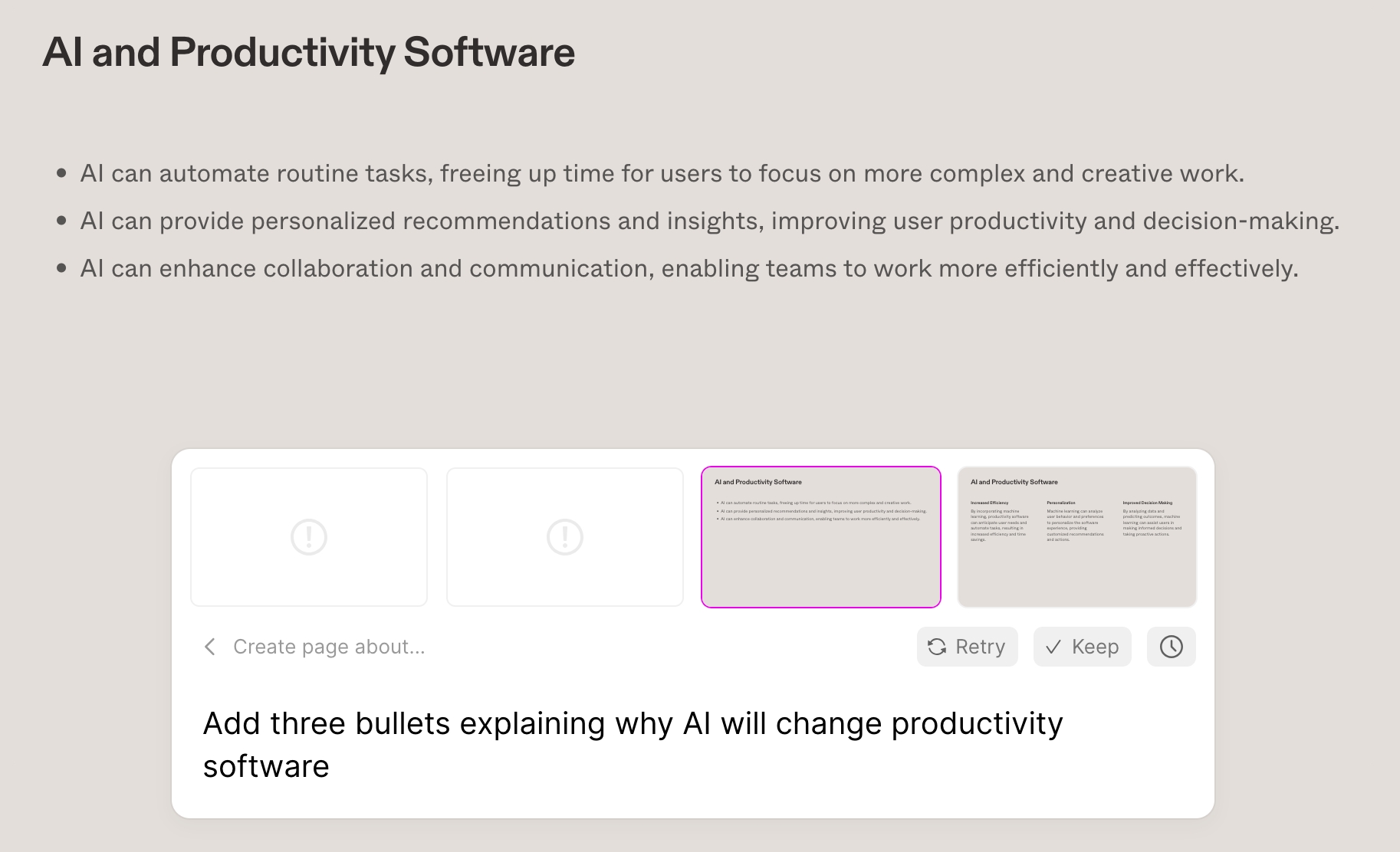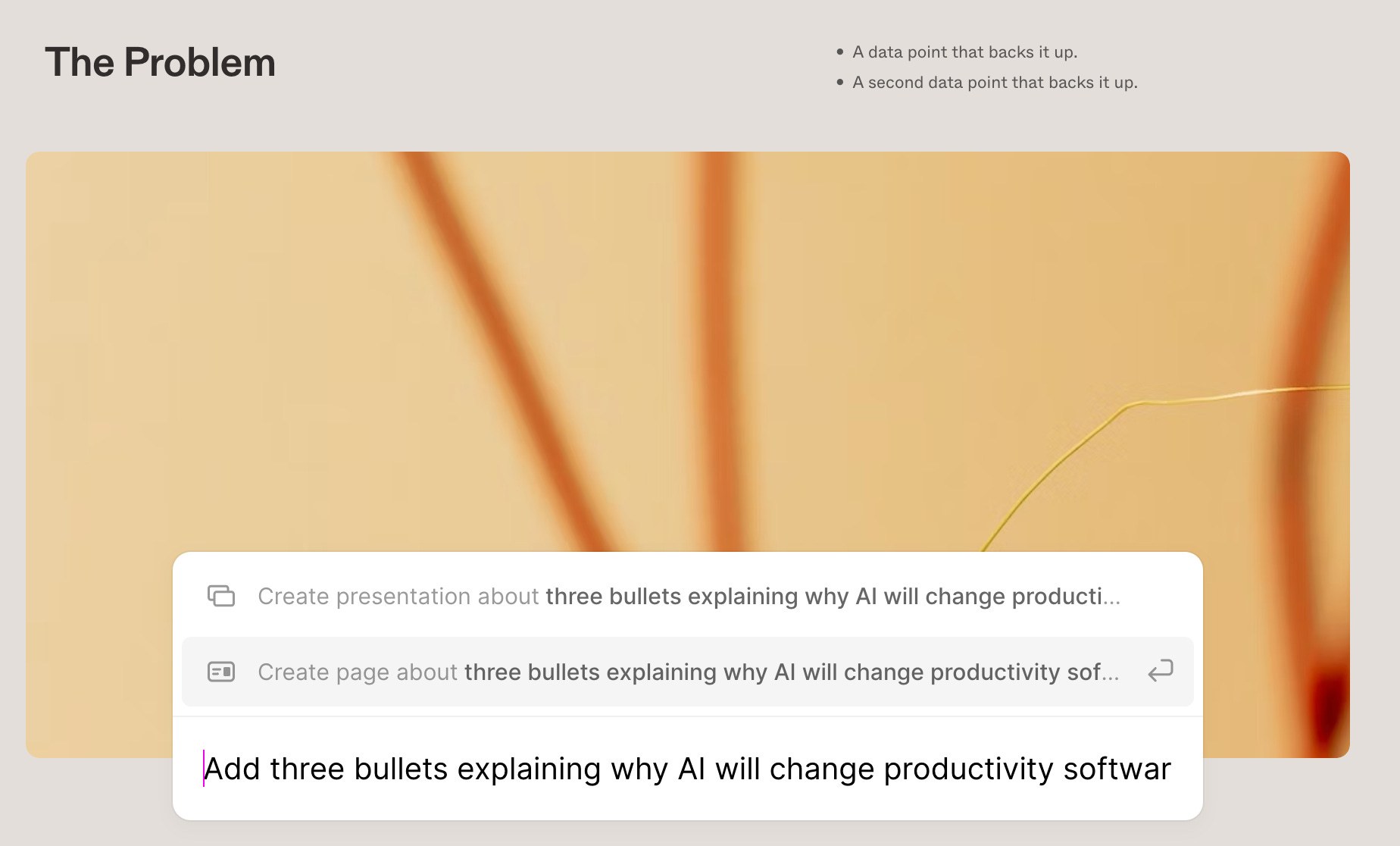 在后来的一张幻灯片上,我又要求提供一些关于人工智能为何将改变生产力软件的要点。