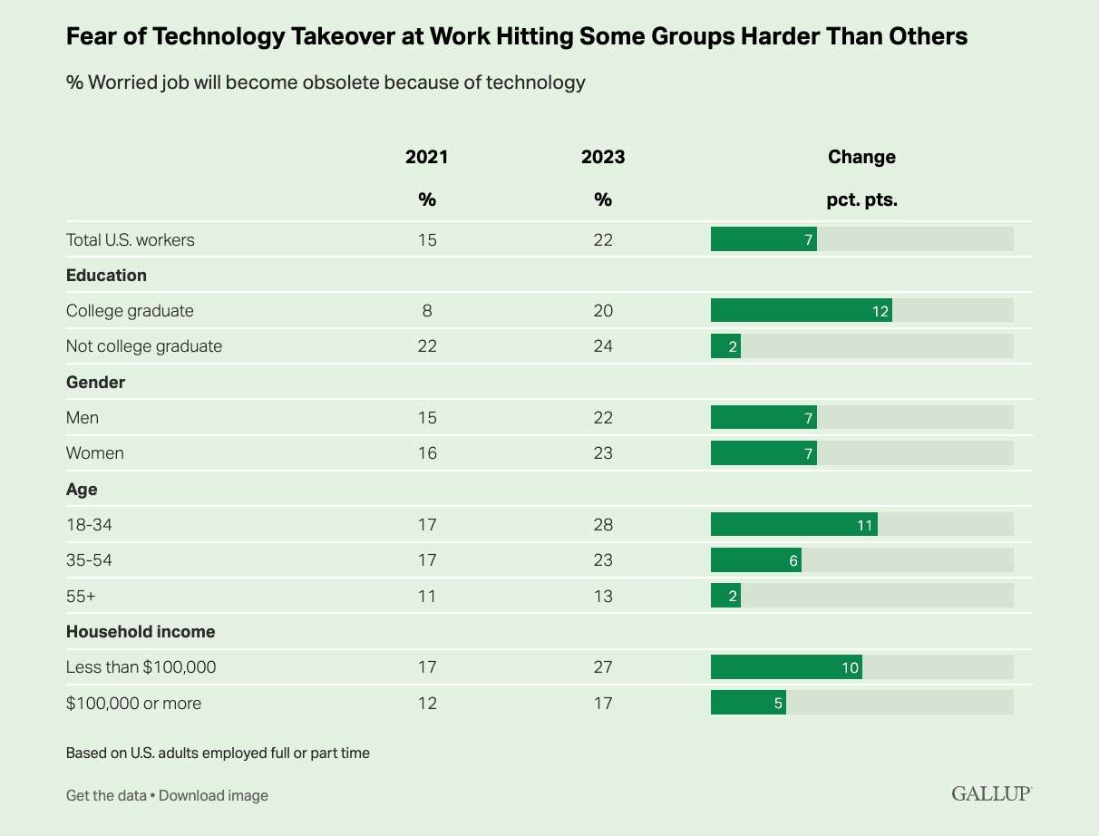 当然了,这种说法有点夸张——实际上,把人类(人物)自动化并不一定是坏事。很多任务都是死记硬背、吃力不讨好的那种,自动化这些任务可以让人类腾出时间来处理更复杂、更有价值的工作。但人工智能进步的速度已经快到令人恐惧的地步。盖洛普的一项新调查发现,现在有 22% 的美国员工担心人工智能会取代他们,而 2021 年这一比例为 15%。没有大学学位的员工对人工智能的恐惧维持在 20% 左右,而拥有大学学位的员工对人工智能的恐惧有所上升,两年内从 8% 大幅增加到 20%。