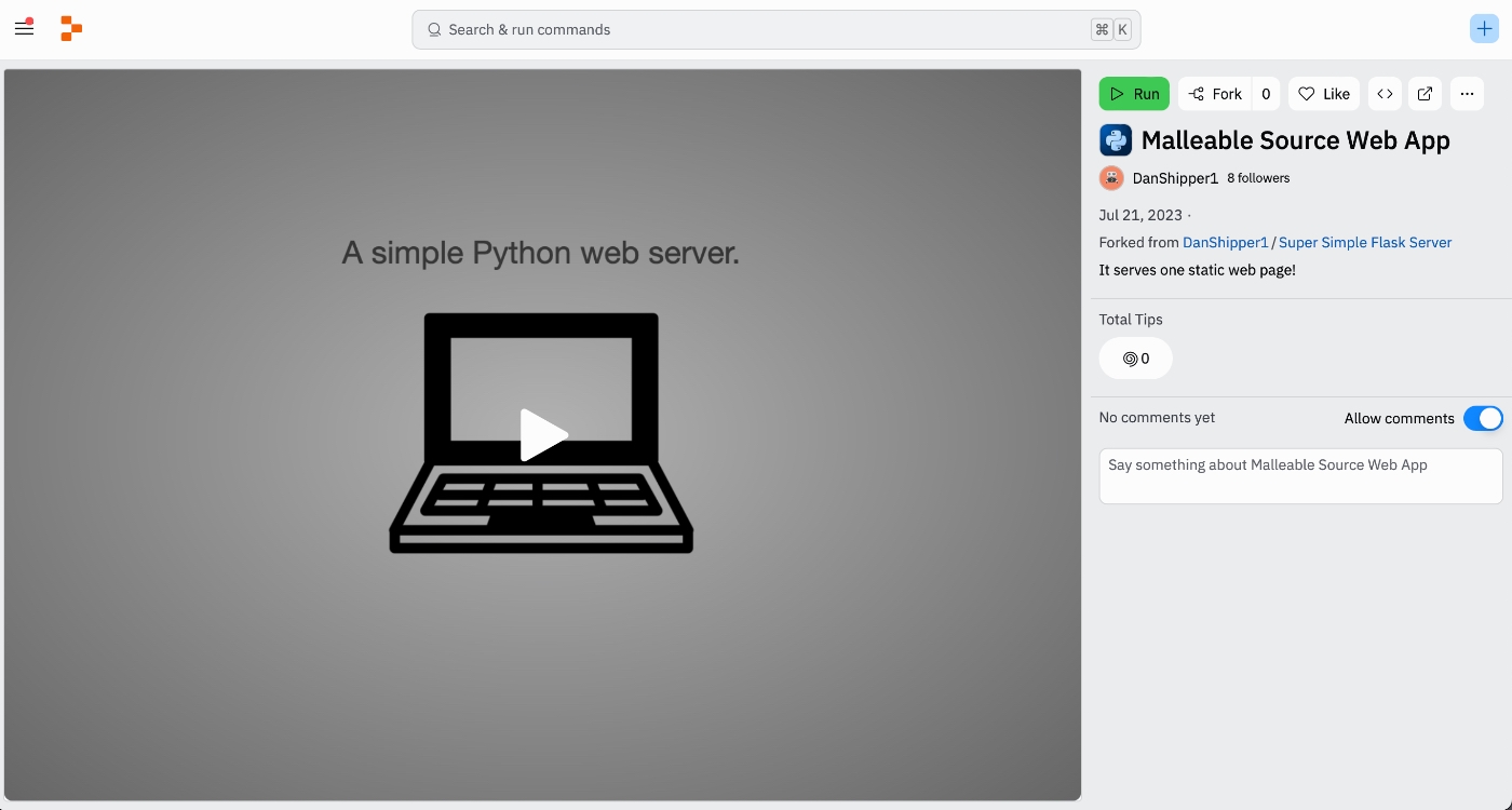 现在轮到你了。我在 Replit 上开发了这个,所以如果你想自己跑起来的话,步骤非常简单。单击[此处](https://replit.com/@DanShipper1/Malleable-Source-Web-App?v=1)并按运行: