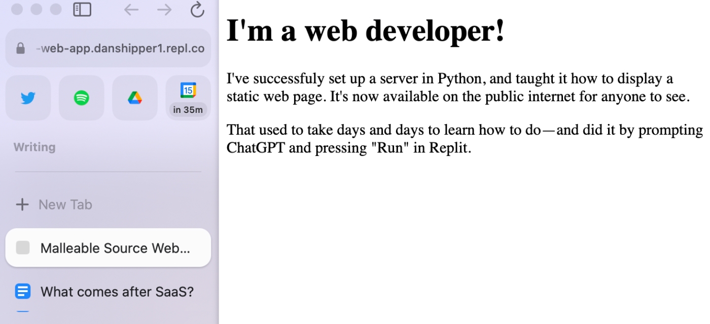 在本文中,我用 ChatGPT 在 Replit 上开发了一个简单的小应用作为演示。这是一个用 Python 编码的 Web 服务器,托管了一个带有特殊消息的网页。你可以到互联网上看我的[这一版](http://malleable-source-web-app.danshipper1.repl.co/):