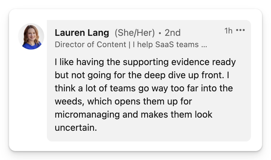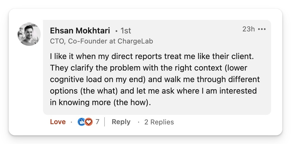 > 好的做法:“两周前我们上一次讨论这个问题时,你说因为 Y的原因,我们应该做 X。我同意这是行得通的,所以我们就去做了,今天我想分享一下我们的想法,然后想听到你的反馈,并分享我们的下一步计划。”
