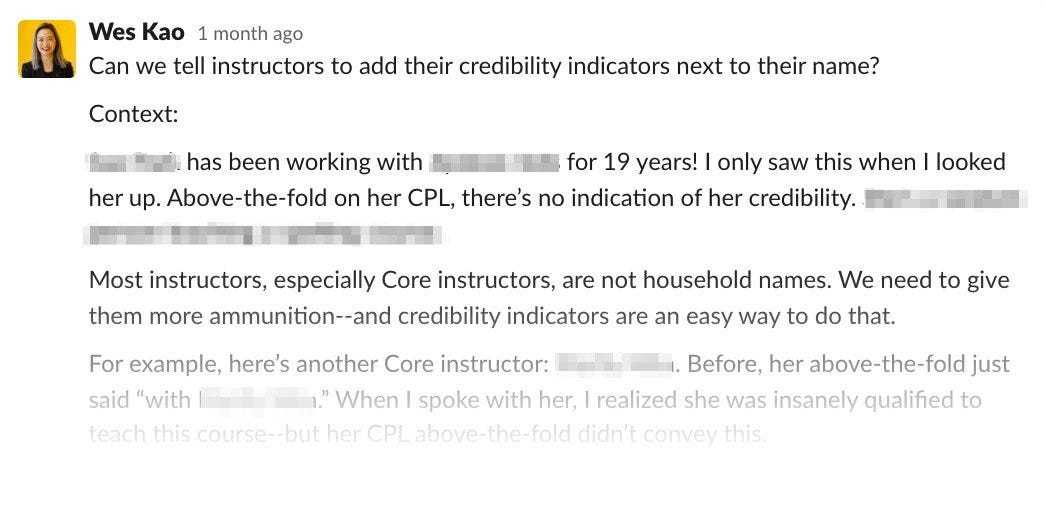 BLUF(Bottom Line Up Front,先给出结论和关键信息)的想法起源于军队,旨在确保沟通尽可能的直接。以下是一条 Slack 消息的示例。请注意我是如何预先提出建议的,然后相关背景如下。