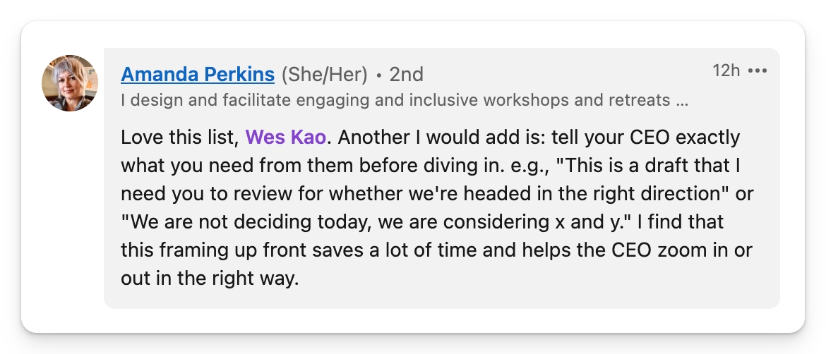 有时候,你可能会对首席执行官对你的态度之直接感到震惊。他们可能会说:“你为什么需要这个?”或“这个东西似乎还不够好,没法交付出去。”他们的开诚布公表明他们对你足够信任,可以直截了当跟你讲话,而且他们跟团队的资深人员交谈的方式可能还更加直接。