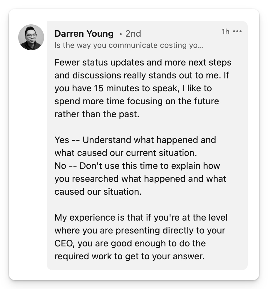 当你对自己所做的工作感到自豪时,很自然地想要多分享一点自己的状态更新。但状态更新是向后看的。过去的事情已经发生了,你无法改变过去。大多数首席执行官更关心接下来会发生什么,因为你仍然可以影响未来朝着有利于你的方向发展。你可能会遭遇如下这样的问题: