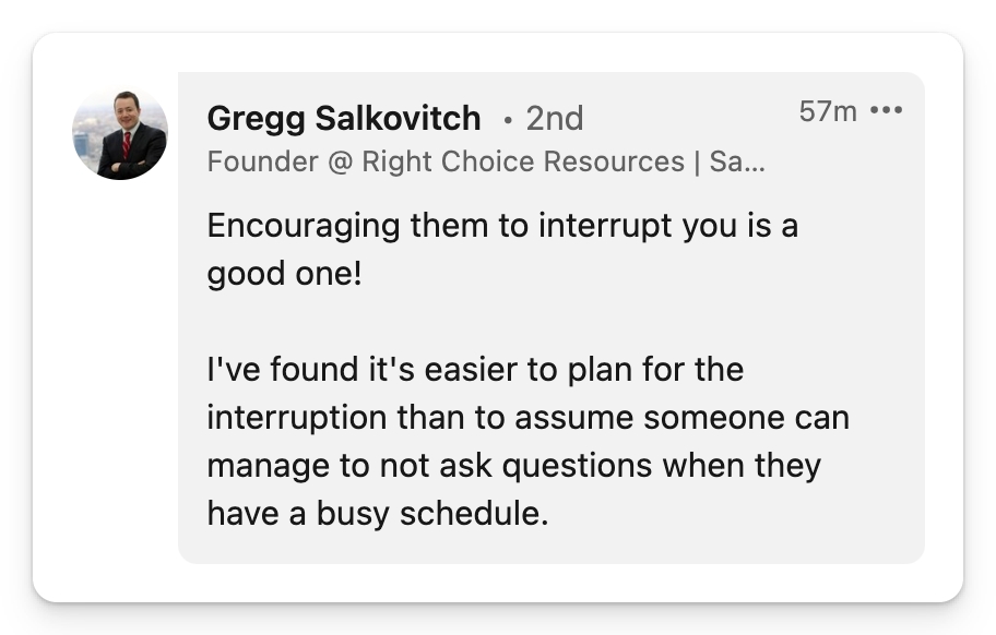 鼓励对方打断你就很好。做好被打断的计划好过假设某人日程很紧设法不问你问题