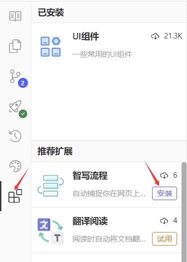 1. 在编辑页面扩展栏搜索并安装<strong>智写流程</strong>插件