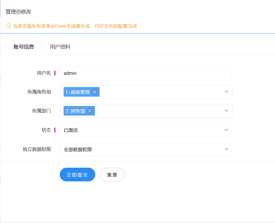 <strong>4 表单Form生成器:</strong>内置50余种表单输入组件,无代码表单生成;支持自定义栅格布局、自定义表单组件、选项卡、触发、验证等;支持场景表单,轻松配置完成不同场景的表单业务。