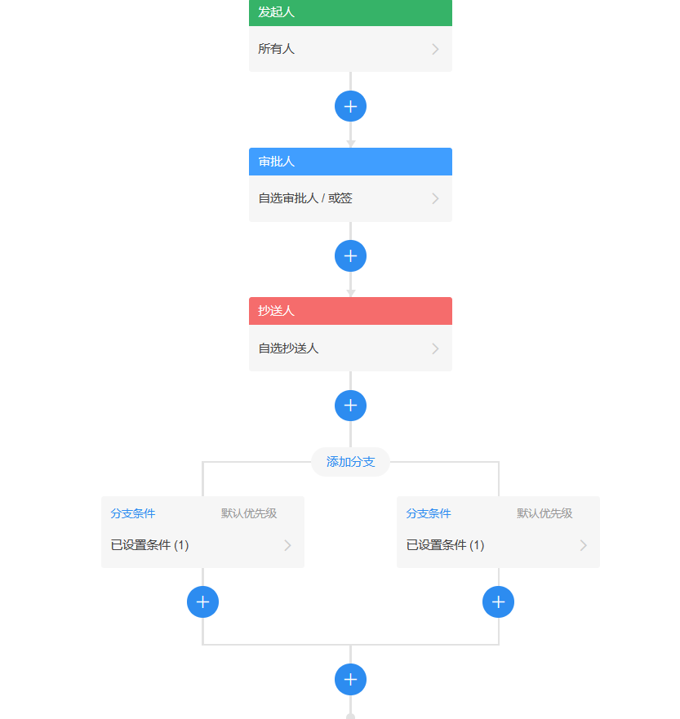 <strong>14 Flow工作流:</strong>审批流程能够支持复杂的多条件分支,可设置不同条件不同流程和审批人。支持指定审批人或自选审批人,审批结果抄送给指定用户,同时也支持多人审批会签与或签,在审批的同时还可以支持修改部分关键信息字段。