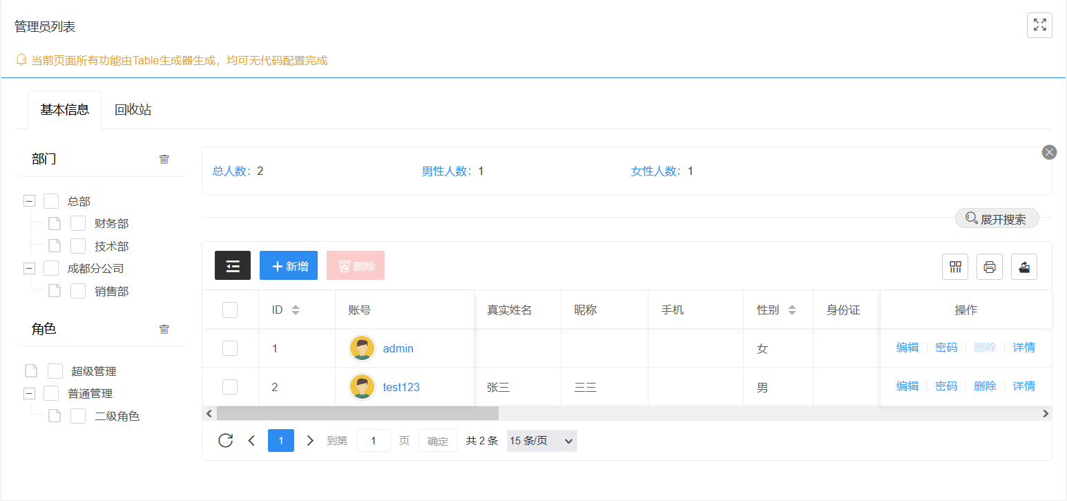 7、RBAC权限管理,独创的节点智能生成,轻松一点,自动完成;权限支持到按钮,没有权限的菜单和按钮轻松隐藏;支持多对多角色,多级角色;支持针对特殊用户独立配置权限。支持6中数据权限,轻松实现只看自己数据、本部门数据等等。