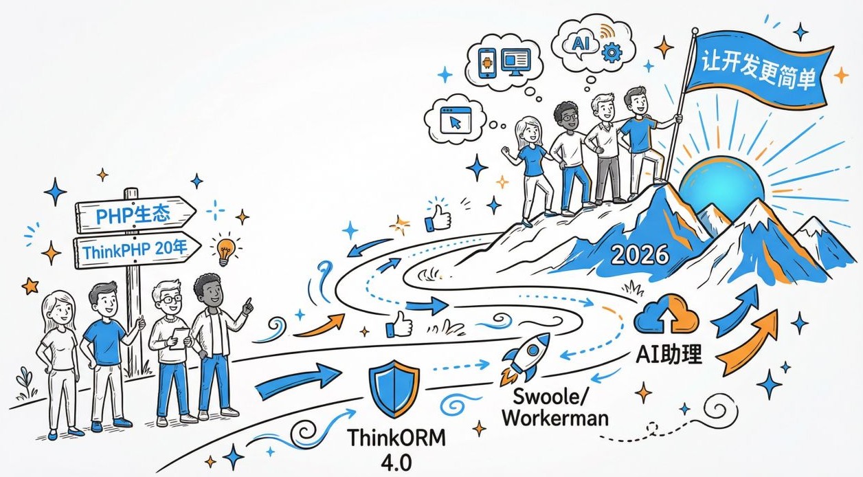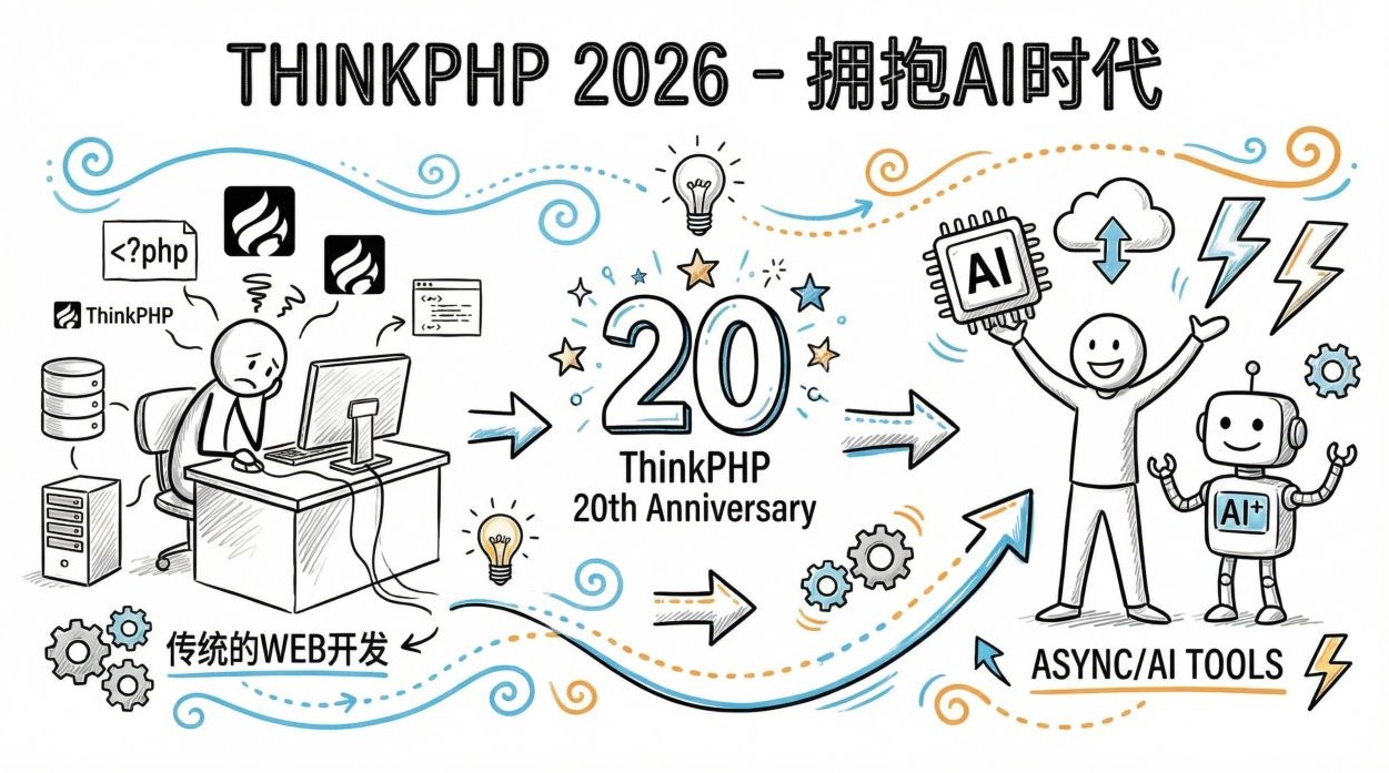 时间已经踏入2026年了,在这个ThinkPHP发布20周年之际,我想和大家聊聊ThinkPHP新的一年以及未来几年的规划和布局。未来三年,是AI时代最关键的几年,也是对ThinkPHP未来定位和发展的考验,站在这个十字路口其实是站在了一个新的起点,如何选择和面对,希望和大家分享我们对未来的思考和计划。