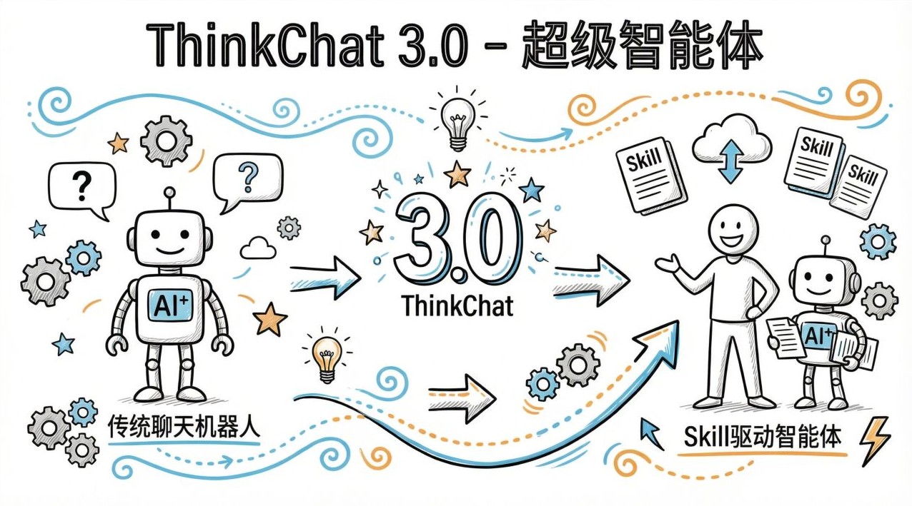> <strong>摘要</strong>:AI 的浪潮正从"对话"涌向"行动"。今天,我们激动地宣布 ThinkChat 3.0 超级智能体正式启动内测。新版全面拥抱基于<strong>容器</strong>和 **Skill(技能)** 的架构理念,并通过为企业量身定制满足需求的相关技能,打造企业专属的、可私有化部署的 AI 生产力引擎,引领业务进入全新的自主智能时代。