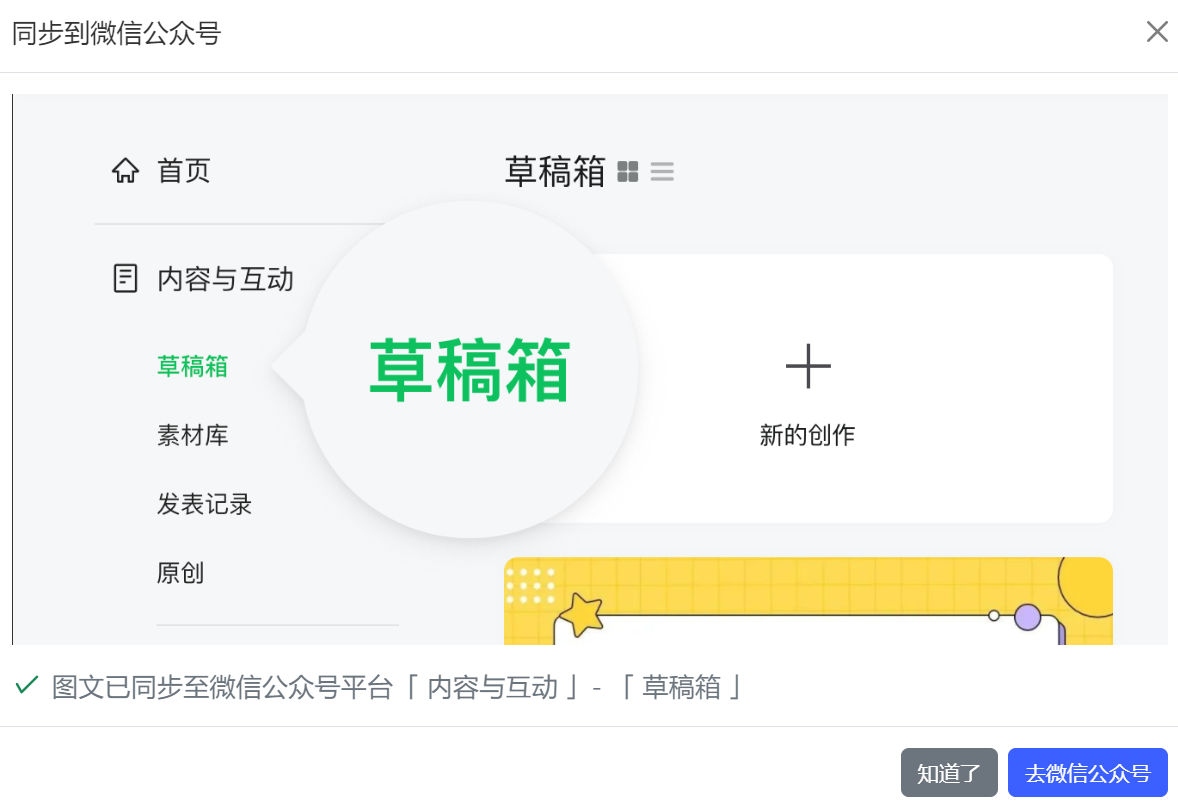 支持把章节内容同步到绑定的公众号草稿箱,然后可以通过微信官方的公众号助手来合并发布。