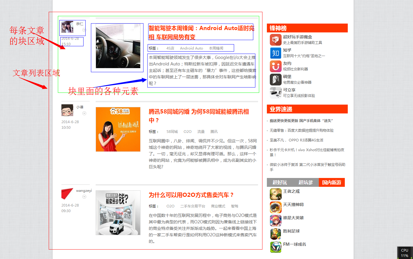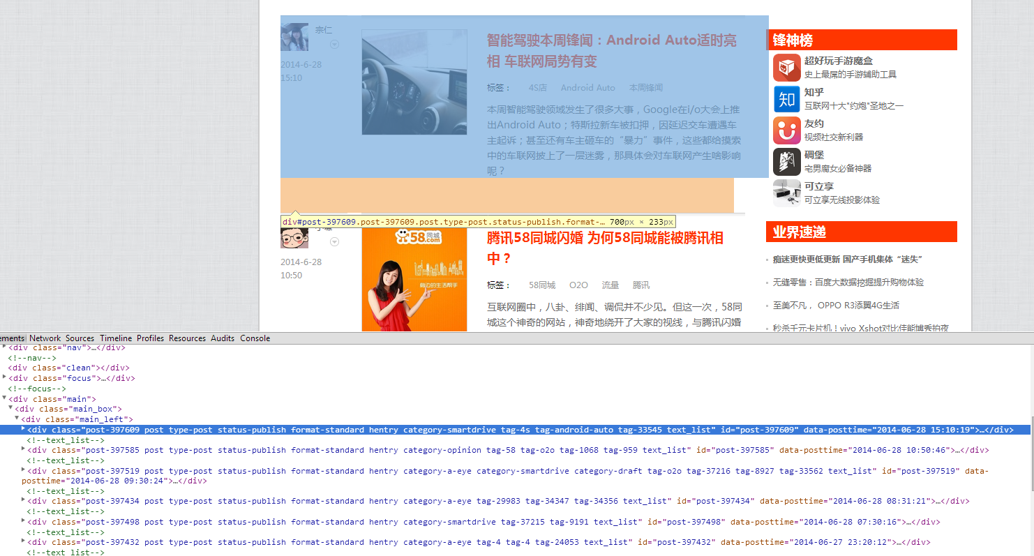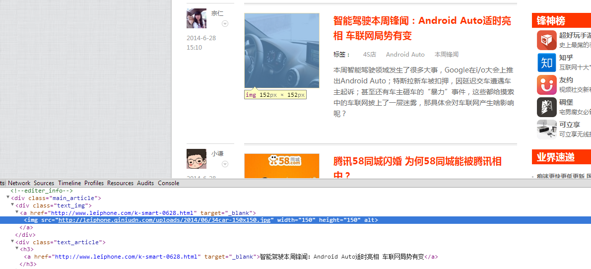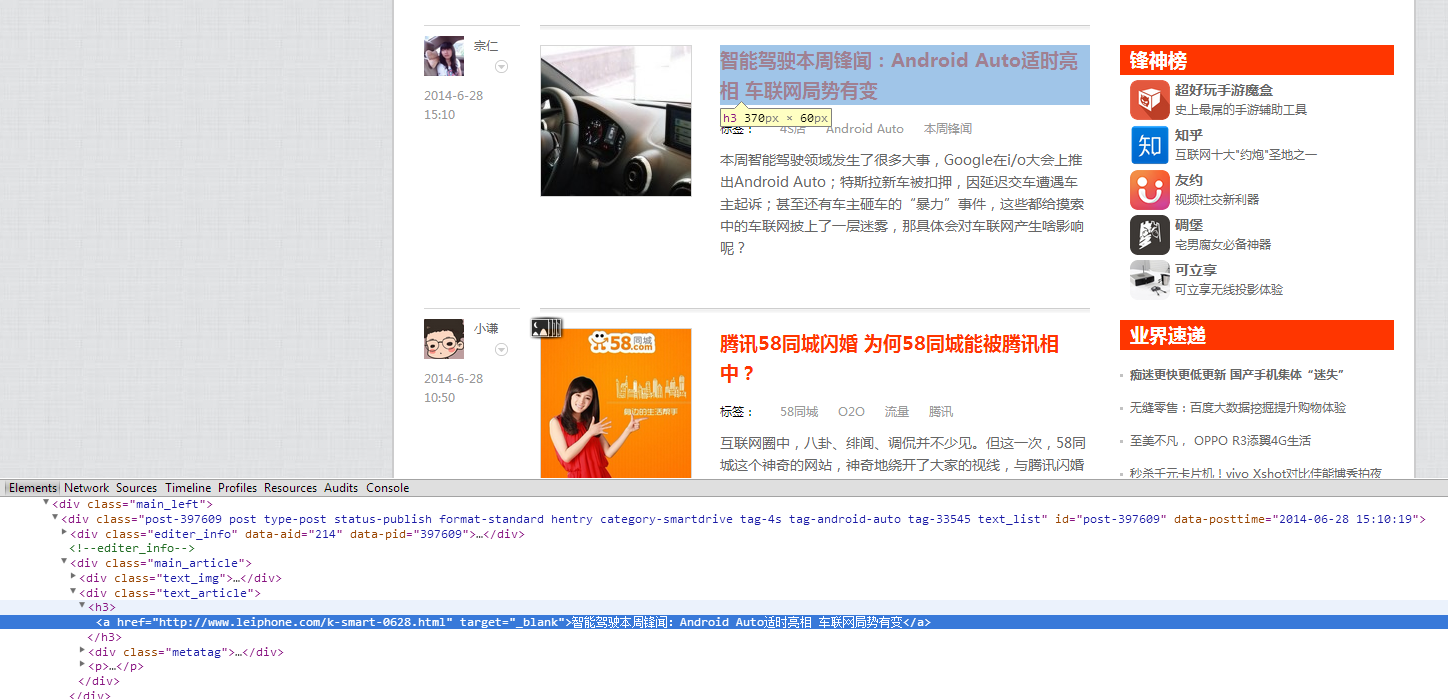 1.打开雷锋网(http://www.leiphone.com/),可以观察到文章列表的样子如下图(点击放大)。