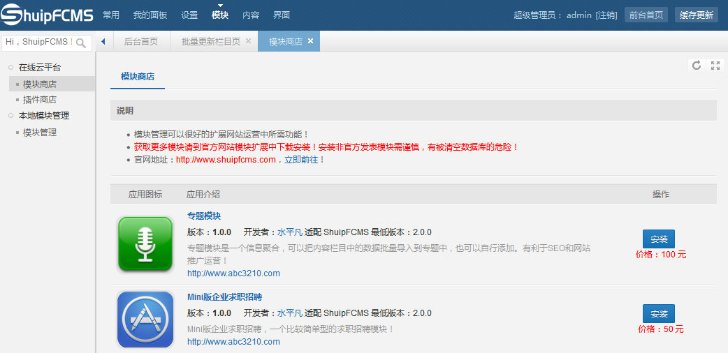 模块的安装,升级工作,都是在这里完成!为了确保正常使用,检查服务器是否有api.shuipfcms.com通信的权限。