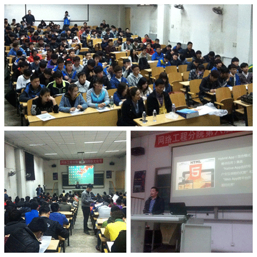 大学生对移动技术也报以如火的热情,报名人数远远超出预期,演讲紧急增加一场,在学校最大的阶梯教室,依然有不少同学聚集在后排站着听完整场演讲。现场的学生小成表示,“大公司看重学历,我想练就一技之长,与本科生竞争。我学过前端知识,听完老师的演讲,我有信心学好Hybrid技术。”也有学生谈到,“我一直想创业,AppCan已经有了大批的成功创业者,有很多可以借鉴的经验,是不错的创业平台。”