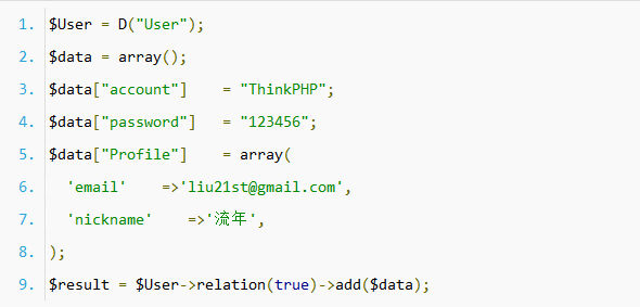 手册上有个一对一关联模型数据写入的例子: