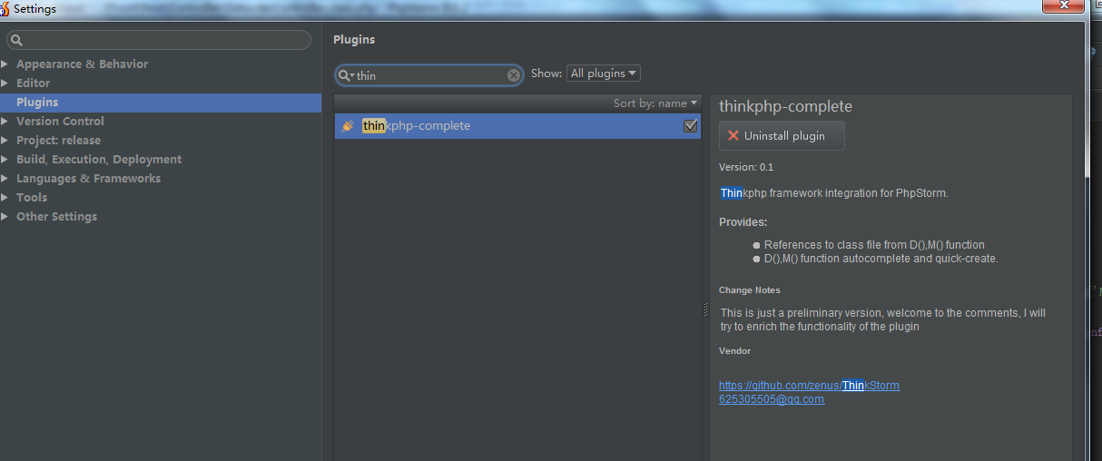 我开始遇到一些问题,比如使用D(),M()方法后,开发ide不能自动的关联到模型文件,不能使用方法补全,这大大的影响了开发效率。在phpstorm上,国外的一些框架yii,laravel...已经有开发者写了相应的插件,解决了这个问题。于是我带着反哺的心,也写出了一个简单的插件。