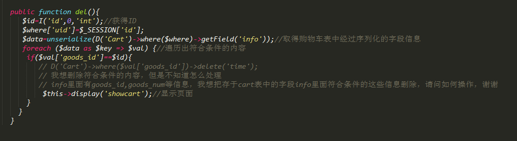 cart表中有一个info字段是经过序列化处理的了,里面存有goods_id,goods_num等信息,现在我想把存于cart表中的字段info里面符合条件的这些信息删除,请问如何操作,下面是代码和数据库中表的内容,希望有大神能帮我看看如何操作,谢谢,,