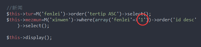 $this->tur=M('fenlei')->order('tertip ASC')->select(); $this->mezmun=M('xinwen')->where(array('fenlei'=>'1'))->order('id desc')->select(); $this->display();