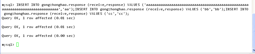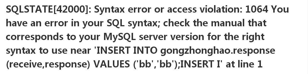 $sql="INSERT INTO gongzhonghao.response (receive,response) VALUES ('aaaaaaaaaaaaaa','aa');I