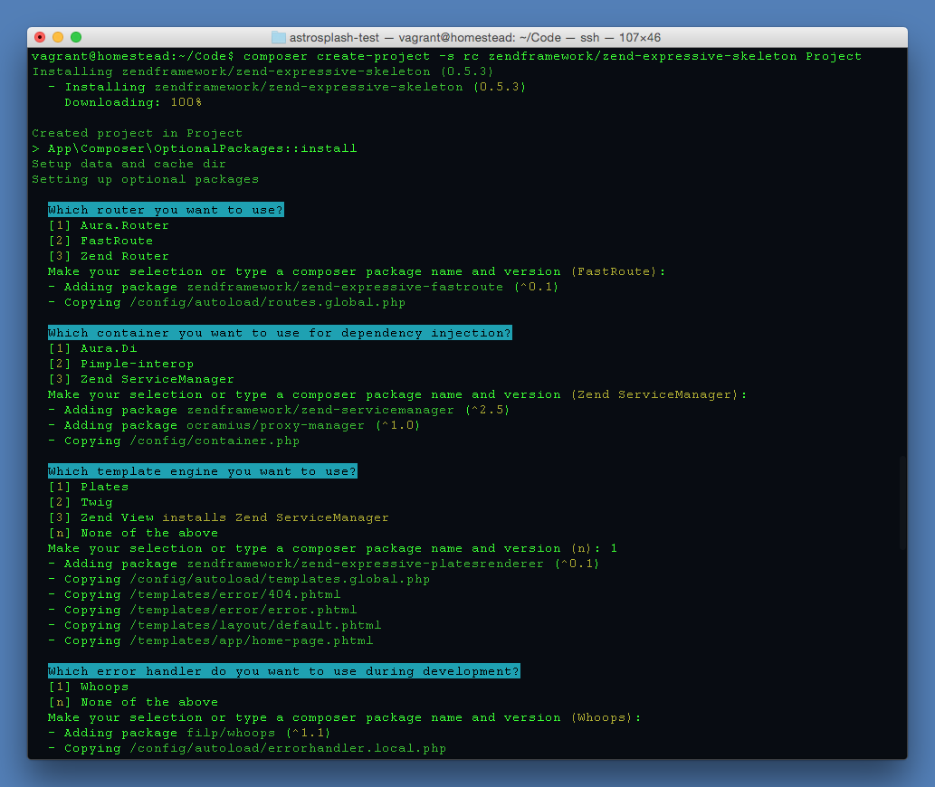 composer create-project -s rc zendframework/zend-expressive-skeleton <project-directory>此处,需要将 <project-directory> 替换为之后安装 Zend Expressive 的目录。在使用 Homestead Improved Vagrant 虚拟机时,此处应为 Project,命令将在 Code 目录下运行。如果安装程序发现 Project 目录已经存在,会删除原有目录,再重新运行该命令。安装程序会让我们选择框架支持的不同组件。大部分情况下,我们会选择默认设置,使用 FastRoute、Zend ServiceManager 与 Whoops 错误处理器。模板引擎没有默认选项,我们将使用 Plates。