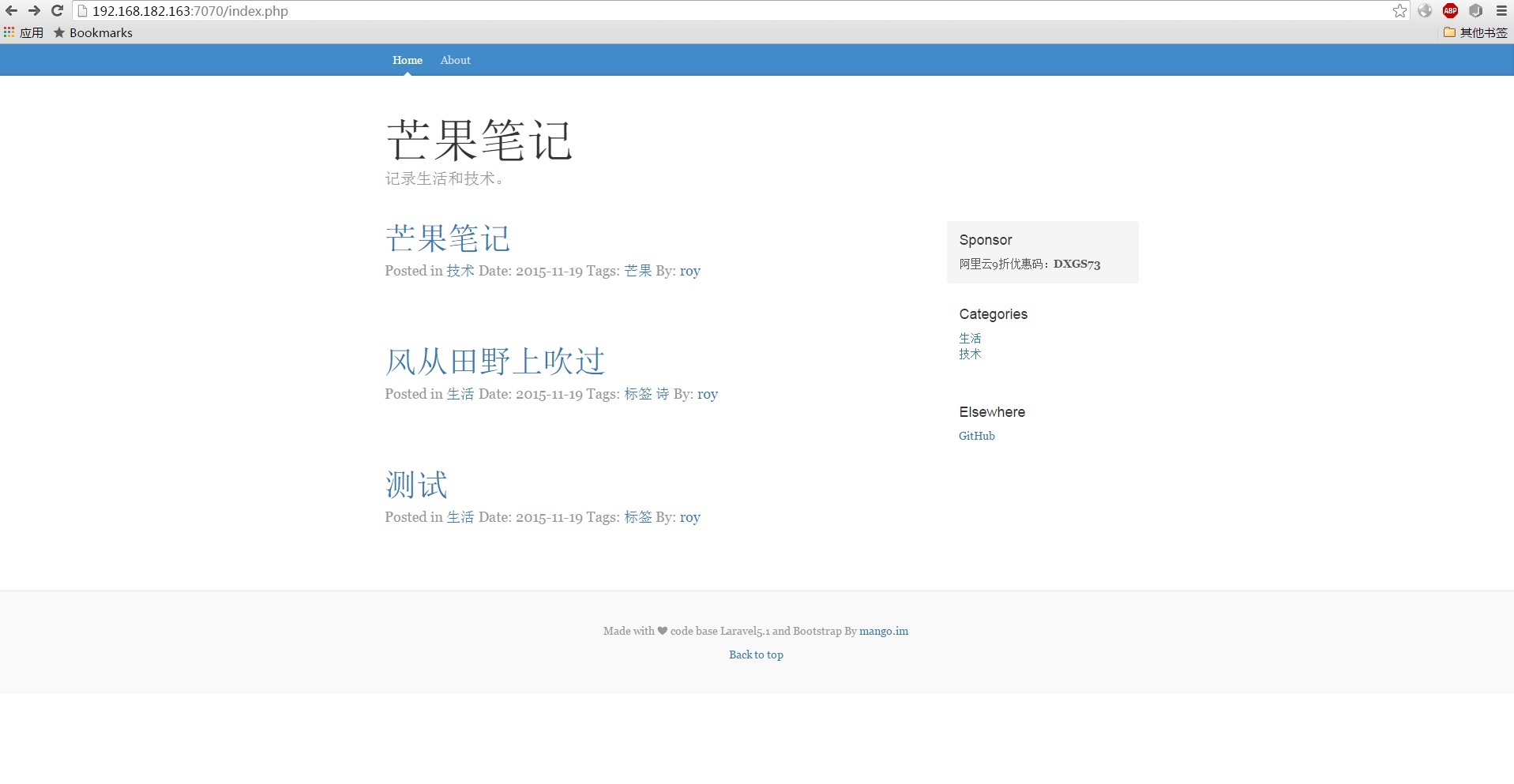 只有框架当然不够,还有许多内容需要添加,在网上能够找到一些基于 Laravel 的开源软件,我们试一个在 Laravel5.1 上简单开发的博客程序,就叫 laravel51,在github 上就可以下载:https://github.com/mangoim/laravel51