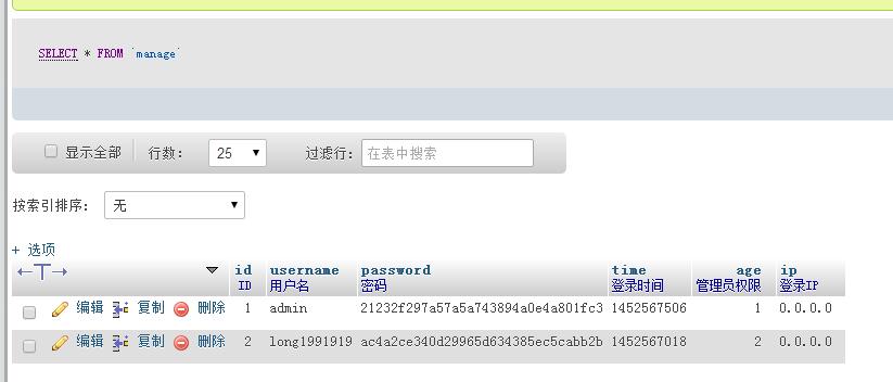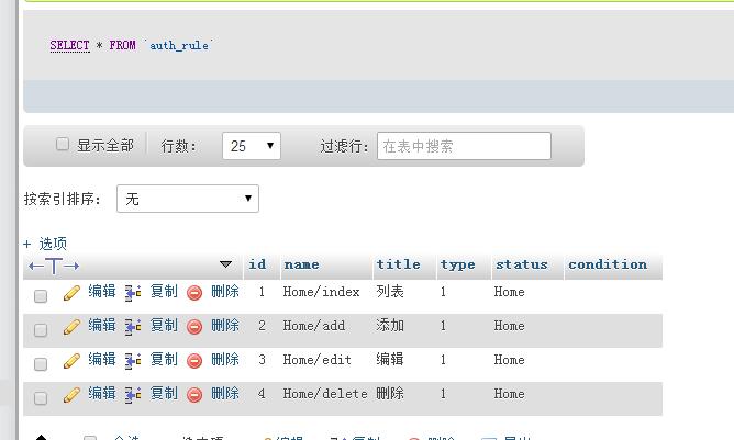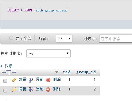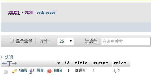 'AUTH_CONFIG'=>array( 'AUTH_ON' => true, //认证开关 'AUTH_TYPE' => 2, // 认证方式,1为时时认证;2为登录认证。 'AUTH_GROUP' => 'auth_group', //用户组数据表名 'AUTH_GROUP_ACCESS' => 'auth_group_access', //用户组明细表 'AUTH_RULE' => 'auth_rule', //权限规则表 'AUTH_USER' => 'manage'//用户信息表 ),
