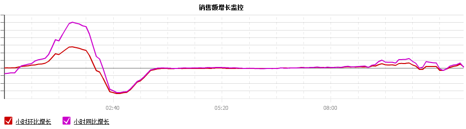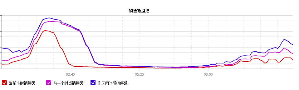 每个公司肯定都有报表可以查到每日、每周、每月等等时间维度的销售额的,对于网店运营人员可能需要关注的更细,往往需要关注每小时的销售情况。当某个时点销售额急剧下降,可能意味着系统或者业务规则出现问题了,需要马上召集相关环节一起排查,尽快恢复,否则销售就丢失了。下面是我们关于某网店销售额的监控截图(出于公司信息保密原则,屏蔽了一些信息,请见谅):