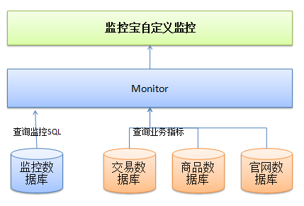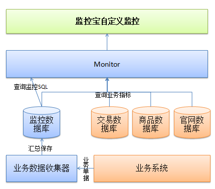 第一版的系统设计非常简单,监控宝的数据都通过monitor提供,monitor系统只需要一张表记录各监控指标查询语句,所有的业务数据都直接通过sql查询业务数据库。这个结构随着业务量增加,会导致业务数据库压力越来越大,有些复杂业务监控sql语句执行性能已经不能被接收了,从而演变成下面这种结构: