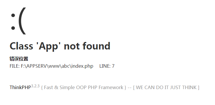 在最开始的自动生成项目目录部分中在网页上打开.php后出现 Class 'App' not found 错误位置 FILE: F:\APPSERV\www\abc\index.php LINE: 7。根据网上办法删除runtime后重新生成都不行,求大神解答