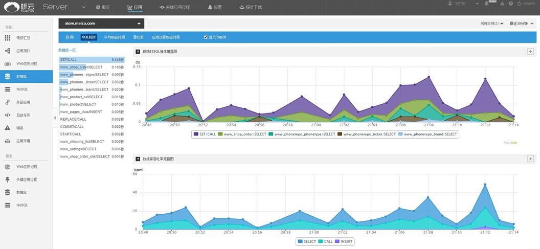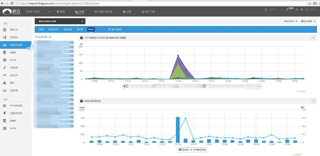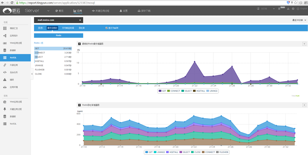 在压测的过程中,我们需要利用到听云的APM,一边压测我们一边看监控,MYSQL端,Redis端,代码层,看看都有什么性能方面的问题。如图所示: